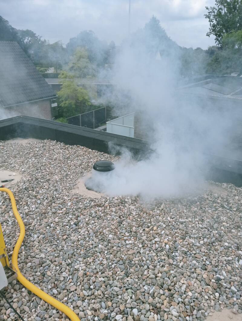 Tijdens de rookproef vulden we het dakleer met rook en zagen we precies waar de rook ontsnapte: bij een beschadigde dakrand en een klein gaatje bij een lasnaad van de zinkwerk afwerking. Het water sijpelde daar langzaam naar binnen, onopgemerkt, en veroorzaakte de vochtplekken in de woonkamer.