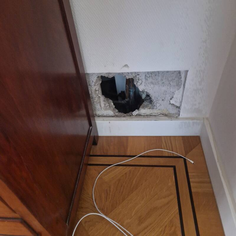 Onze specialisten kwamen ter plaatse met professionele apparatuur. Met behulp van thermografische camera’s, vochtmetingen en een rookproef konden we de oorzaak achterhalen: een gesprongen koppeling in de koudwaterleiding onder de vloer van de bovenwoning. Het lek liep precies langs een dragende muur naar beneden – onzichtbaar, maar verraderlijk.